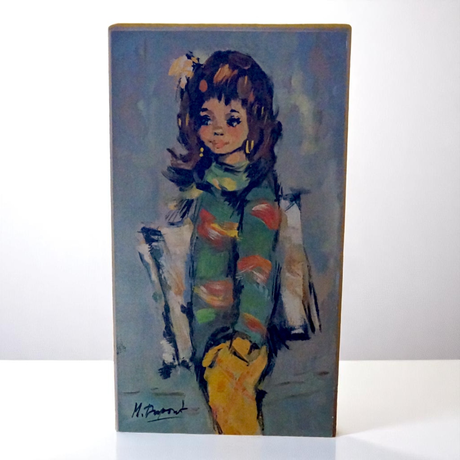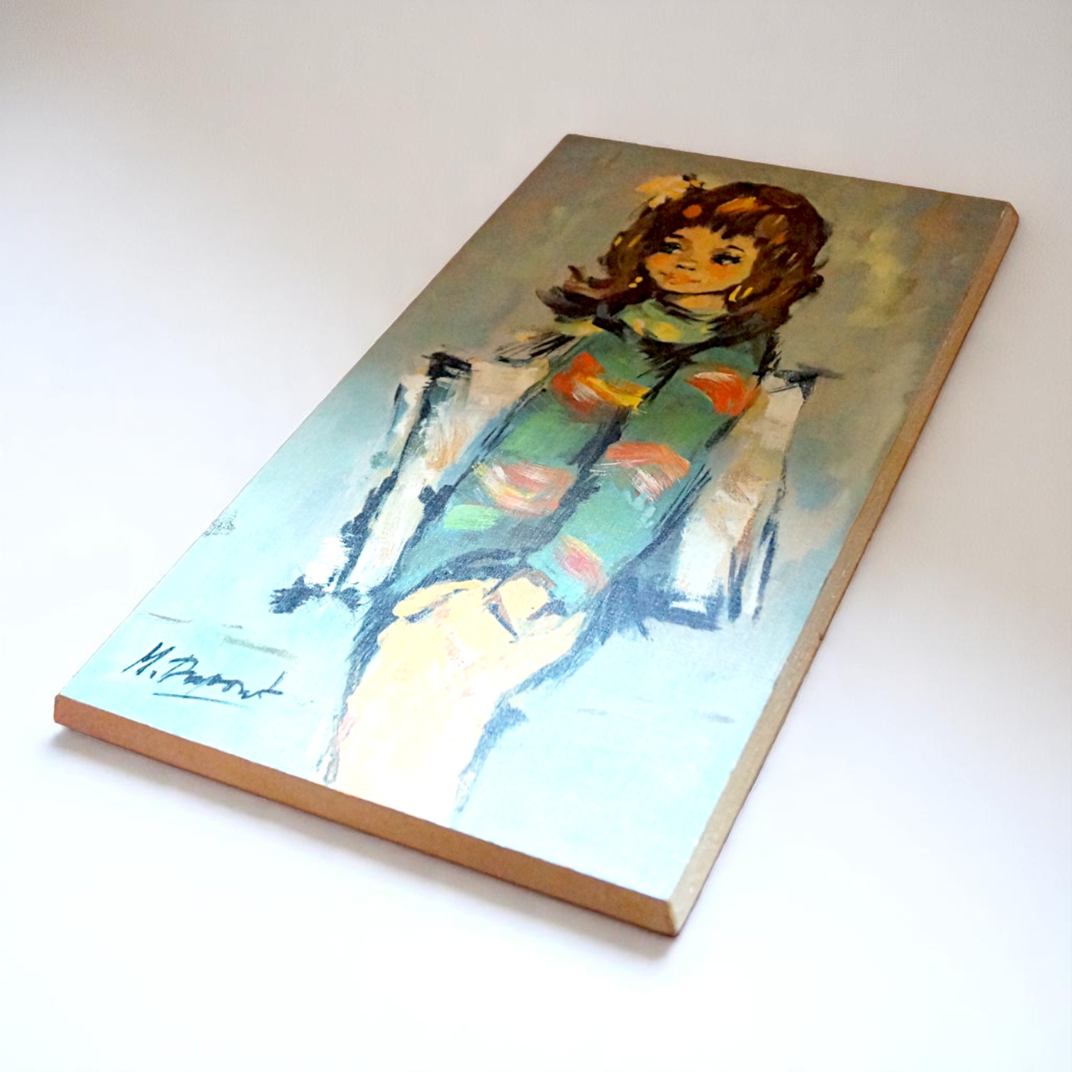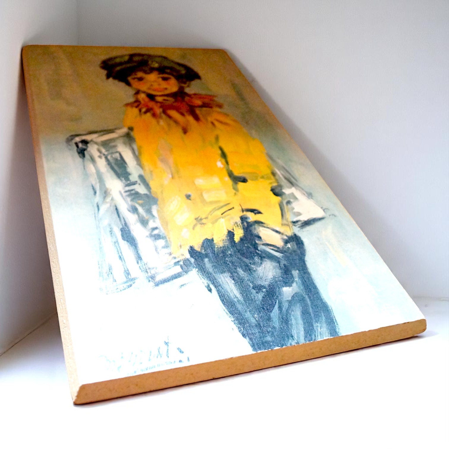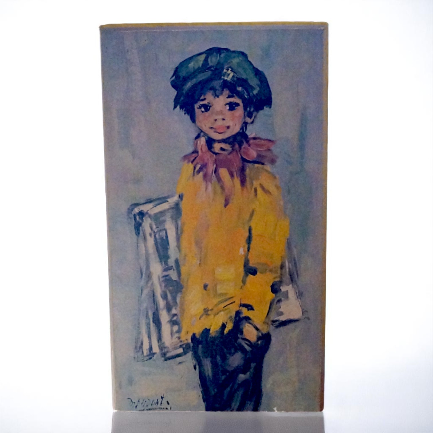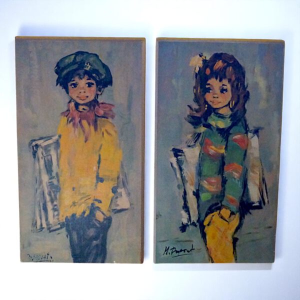 Diese Bilder zeigen hochwertige Drucke, welche auf Holz fest verklebt wurden. Die Bilder stammen von Maurice Dupont und sind aus den 1960ern. Je nach Quelle und Übersetzung heißen sie „Junge mit Mütze“ oder „Junge mit Tasche“ und „Bright Youth No.2“ oder „Mädchen mit Papier“. Gerade als 2-er Set machen sie einiges her und sind Objekte, die auf wundervolle Art nachdenklich machen können.
